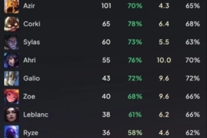 狐狸55场76%胜率;加里奥43场72%胜率;佐伊40场68%胜率;