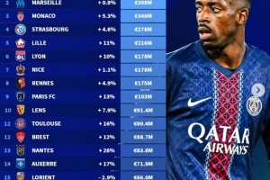 体育资讯10月11日讯 德国转会市场公布了新一期法甲俱乐部身价情况,巴黎圣日耳曼以11.5亿欧元断层领先,位居次席的马赛为3.98亿欧元。