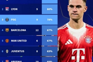 拜仁近20个赛季欧冠对巴黎胜率78%,至少对阵5次球队中胜率第3