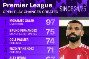 体育资讯10月16日讯 日前,Squawka统计了英超运动战创造机会次数排行。