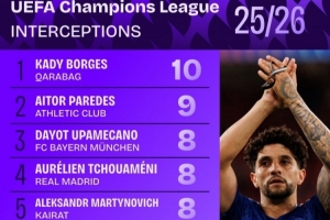 体育资讯10月23日讯 欧冠第3轮已经完赛,数据机构squakwa统计了本赛季至今的欧冠拦截情况,