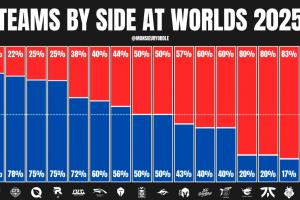 体育资讯10月28日讯 外媒统计S15全球总决赛各队红蓝方占比,具体如下(以下仅介绍八强队伍):