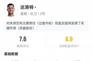 体育资讯8月31日讯 2025-26赛季英超第3轮,曼联3-2险胜伯恩利。达洛特本场首发出战,贡献1次助攻,送出2次关键传球,还有3次过人成功以及2解围2抢断,但也有全场最多的23次丢失球权,评分7.6。