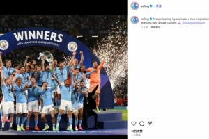 哈兰德晒出了京多安作为队长捧起队史首座欧冠奖杯的照片,并配文:“始终以身作则,真正鼓舞大家。祝你一切顺利,Gundo(对京多安的昵称)!”