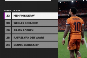数据统计显示,自1978年世界杯以来,德佩是荷兰队助攻数并列最多的球员。
