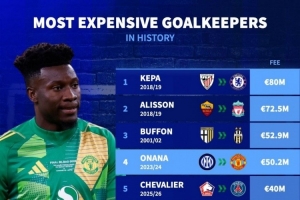 体育资讯9月9日讯 德国转会市场统计了门将的转会费,并列出榜单,凯帕8000万欧居首,阿利森、布冯、奥纳纳排名前四。