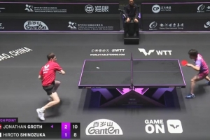 WTT中国澳门冠军赛男单1/16决赛,格罗特3-1逆转击败篠塚大登,四局比分为3-11、12-10、12-10、11-8。