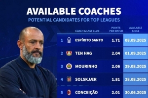 体育资讯9月10日讯 德国转会市场盘点了目前赋闲的教练,穆里尼奥、滕哈赫、哈维、努诺在列。