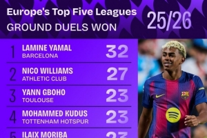 体育资讯9月12日讯 Squawka统计了本赛季球员在五大联赛的地面对抗成功次数,并列出榜单。