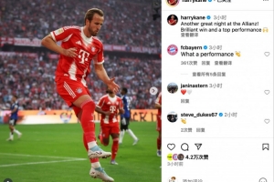 凯恩社媒写道:又一个在安联球场的美妙之夜!精彩的胜利和顶级的表现 🙌
