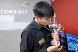 比赛间隙WST官推更新了一段赵心童领取复刻版世锦赛冠军奖杯的视频,视频中赵心童笑着打趣道“这也太小了吧”!引发周围工作人员欢笑,之后赵心童亲吻了冠军奖杯复刻品。