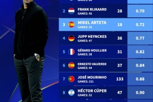 体育资讯9月17日讯 数据显示,阿尔特塔带阿森纳参加25场欧冠仅丢18球,场均0.72丢球排在历史第三。