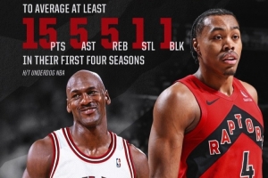 生涯前四季,斯科蒂-巴恩斯场均17.2分7.5篮板5助攻1.2抢断1盖帽;乔丹前四季场均32.7分5.6篮板5.3助攻2.8乔丹1.3盖帽。