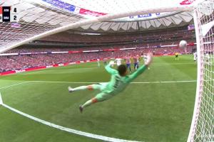 体育资讯09月27日讯 马竞vs皇马第63分钟,阿尔瓦雷斯任意球轰十分角!单场梅开二度!2轮轰5球!马竞4-2领先皇马!