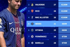 体育资讯9月30日讯 此前有报道称曼城等球队有意引进巴黎球员内维斯,德转也盘点了目前世界足坛中前卫球员身价榜,其中佩德里以1.4亿欧居首,内维斯高居第五。具体如下: